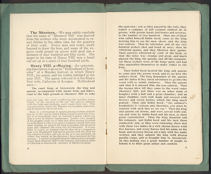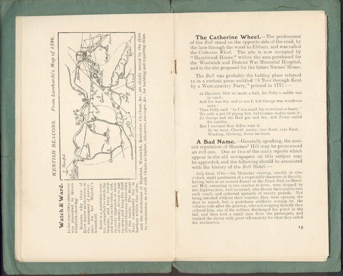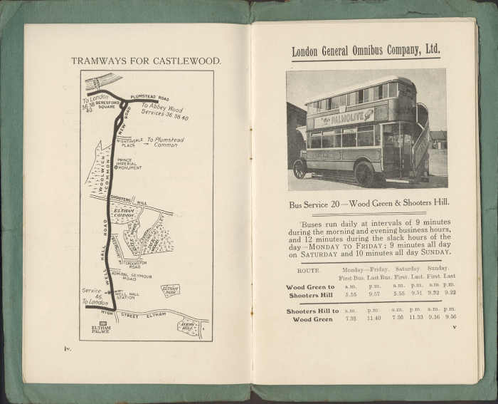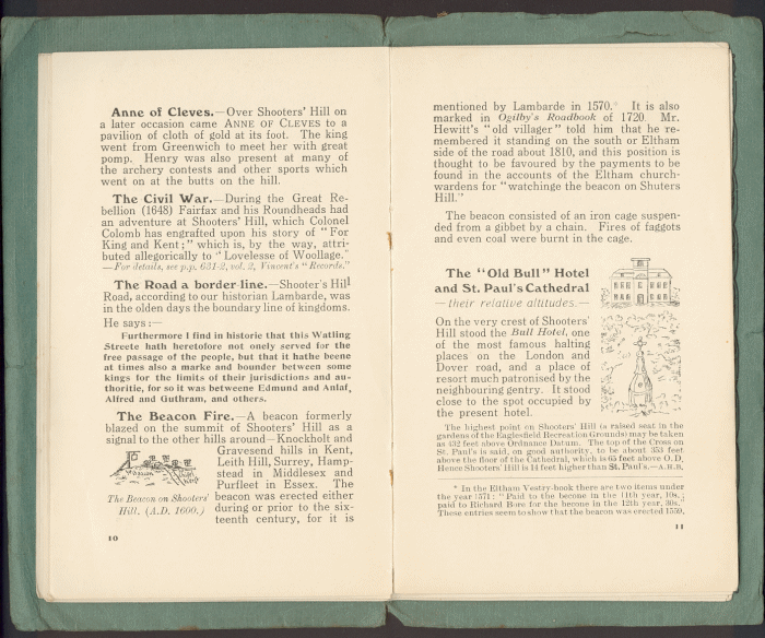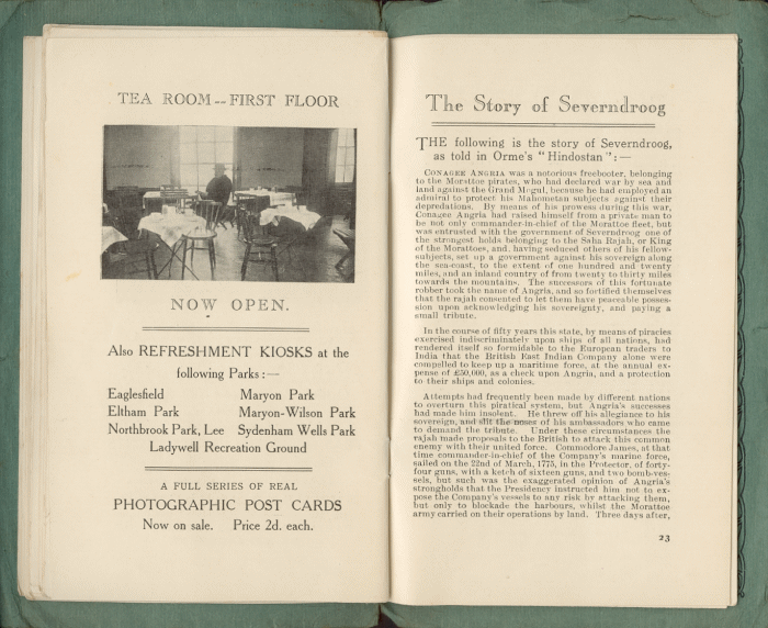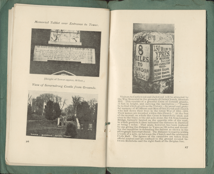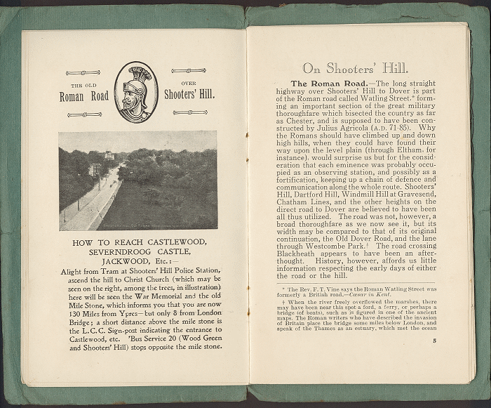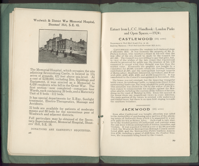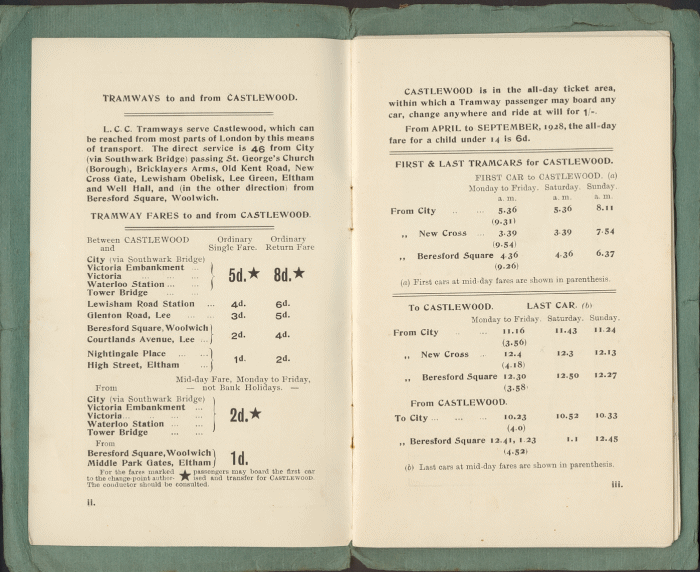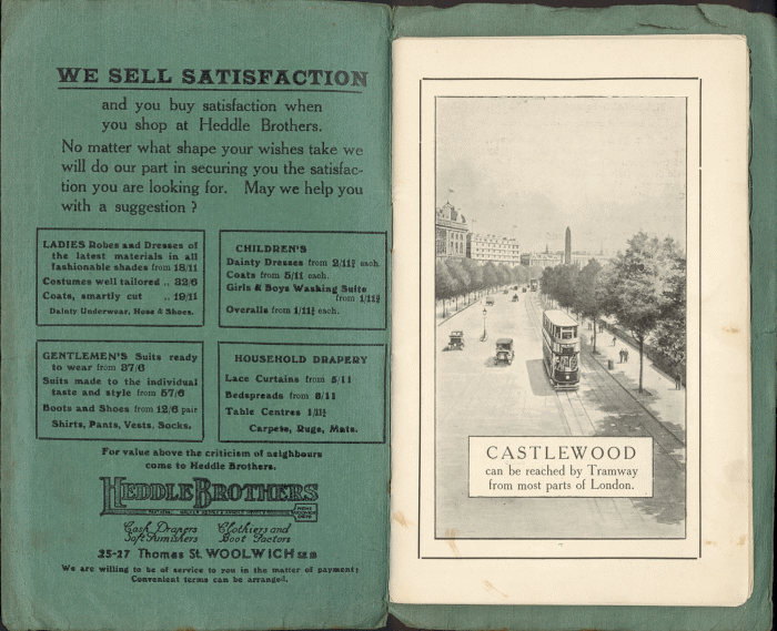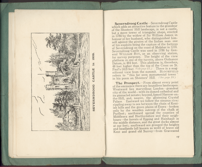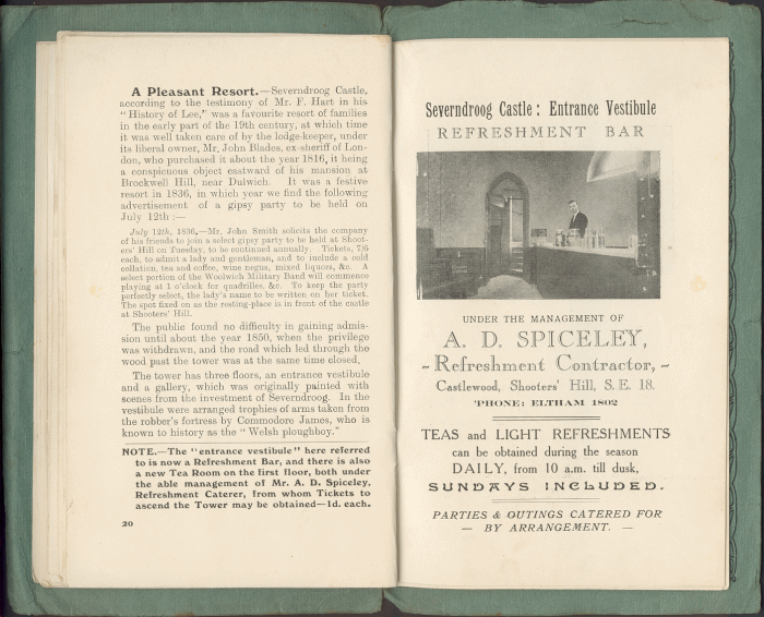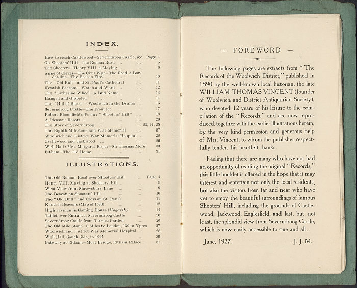 This booklet was produced around 1928 and cost 6D. It contains details of the tram times and fares, bus service, the story of Severndroog, information about the some of the woods and parks plus advertisements for some of the local businesses of the time.